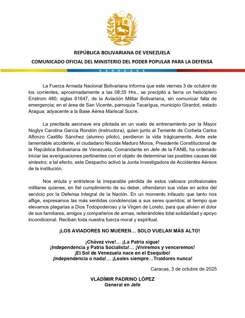 Comunicado Oficial del Ministro del Poder Popular para la Defensa, GJ. Vladímir Padrino López, con motivo del accidente aéreo ocurrido en el estado Aragua.Por YAHINIR JAVIER SEGOVIA ALVAREZ / 03/10/2025