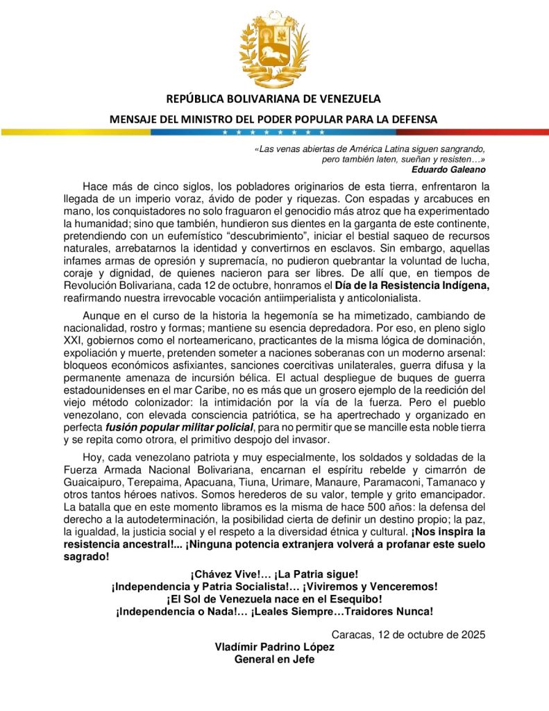 Mensaje del ciudadano GJ Vladímir Padrino López, con motivo al 533° Aniversario de la Resistencia Indígena.Por GENESIS MICHELLE SALLORIN PINTO / 12/10/2025