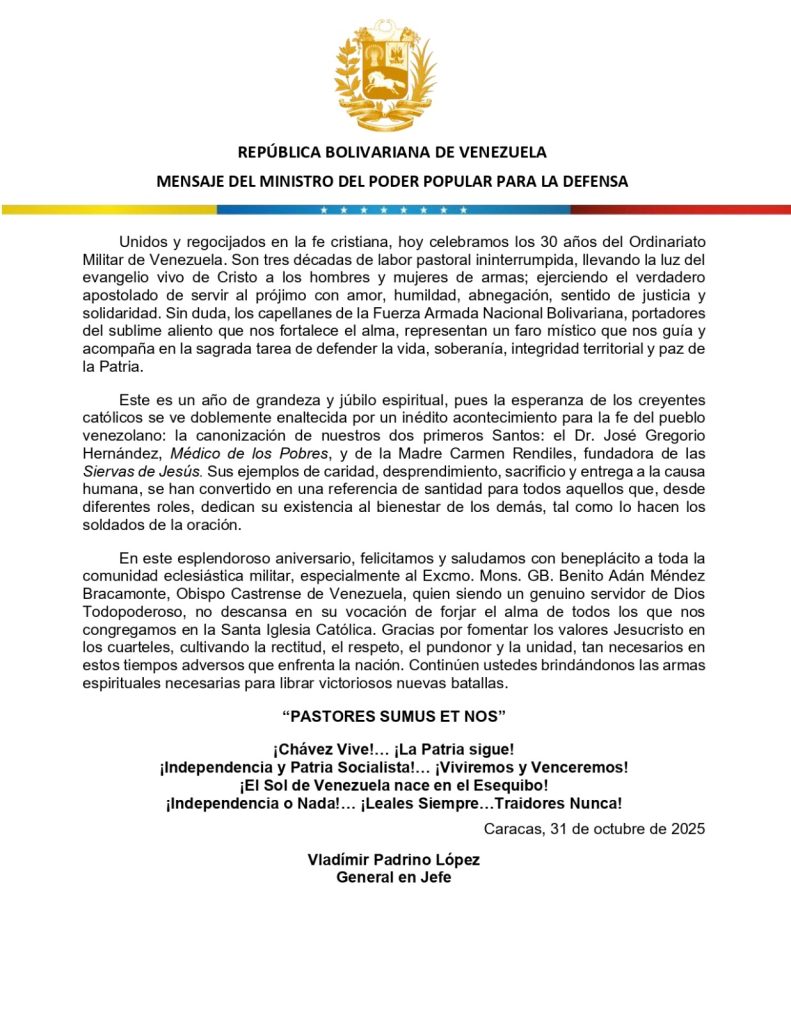 Mensaje del ciudadano General en Jefe Vladímir Padrino López con motivo del 30° Aniversario del Ordinariato Militar de Venezuela.Por GENESIS MICHELLE SALLORIN PINTO / 31/10/2025