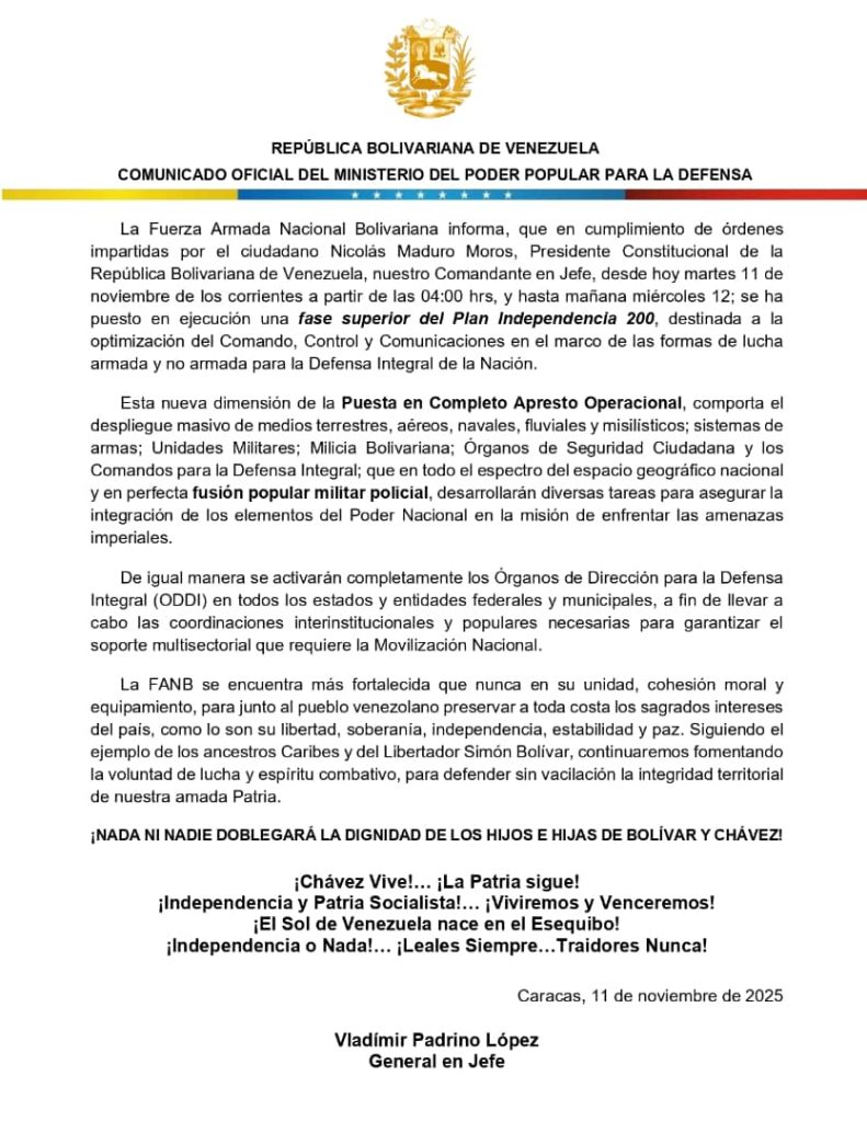 Comunicado Oficial del Ministro del Poder Popular para la Defensa, GJ. Vladímir Padrino López dando inició a la fase superior del Plan Independencia 200 en todo el territorio nacional.Por GENESIS MICHELLE SALLORIN PINTO / 11/11/2025