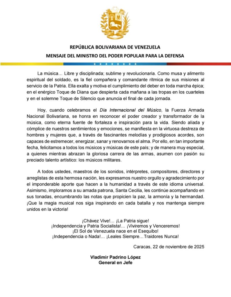 Mensaje del ciudadano GJ Vladimir Padrino López, en ocasión de celebrarse el Día Internacional del Músico.Por Cap Alejandro J. Cesar R. / 22/11/2025