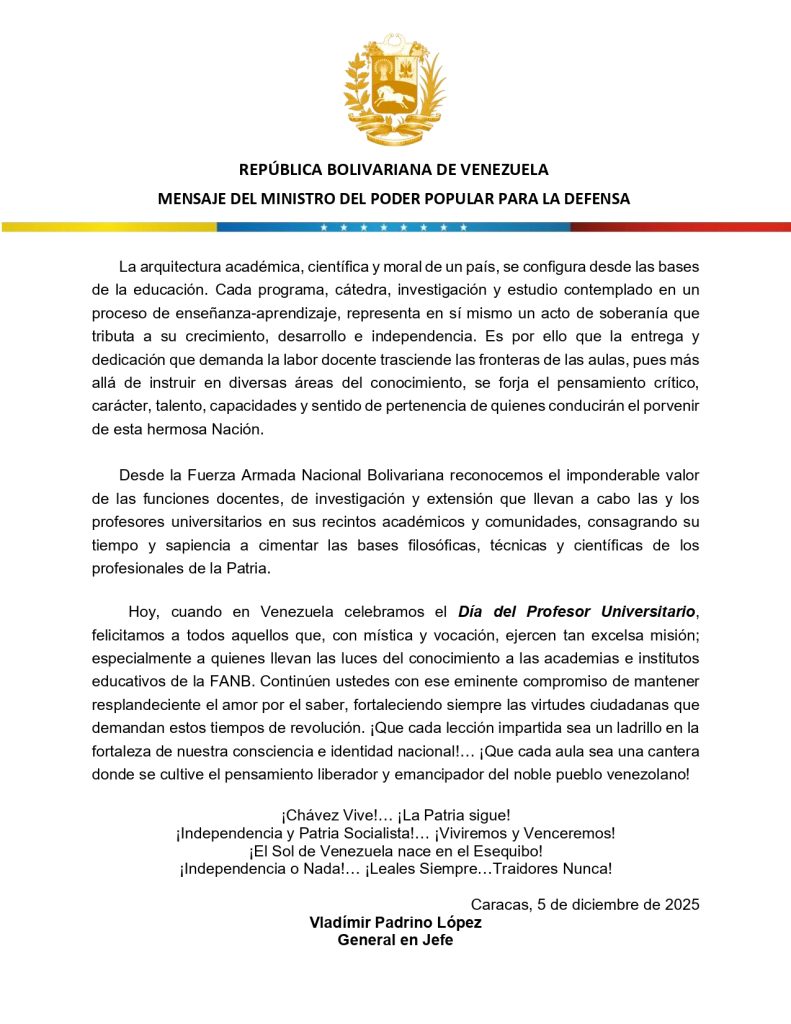 Mensaje del ciudadano GJ Vladímir Padrino López, con motivo a celebrarse el Día del Profesor UniversitarioPor ORIANA CAROLINA NIEVES HERRERA / 05/12/2025