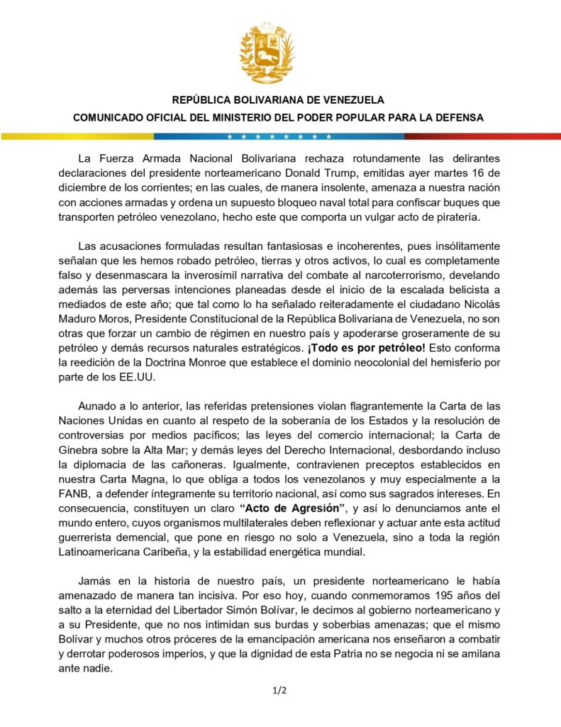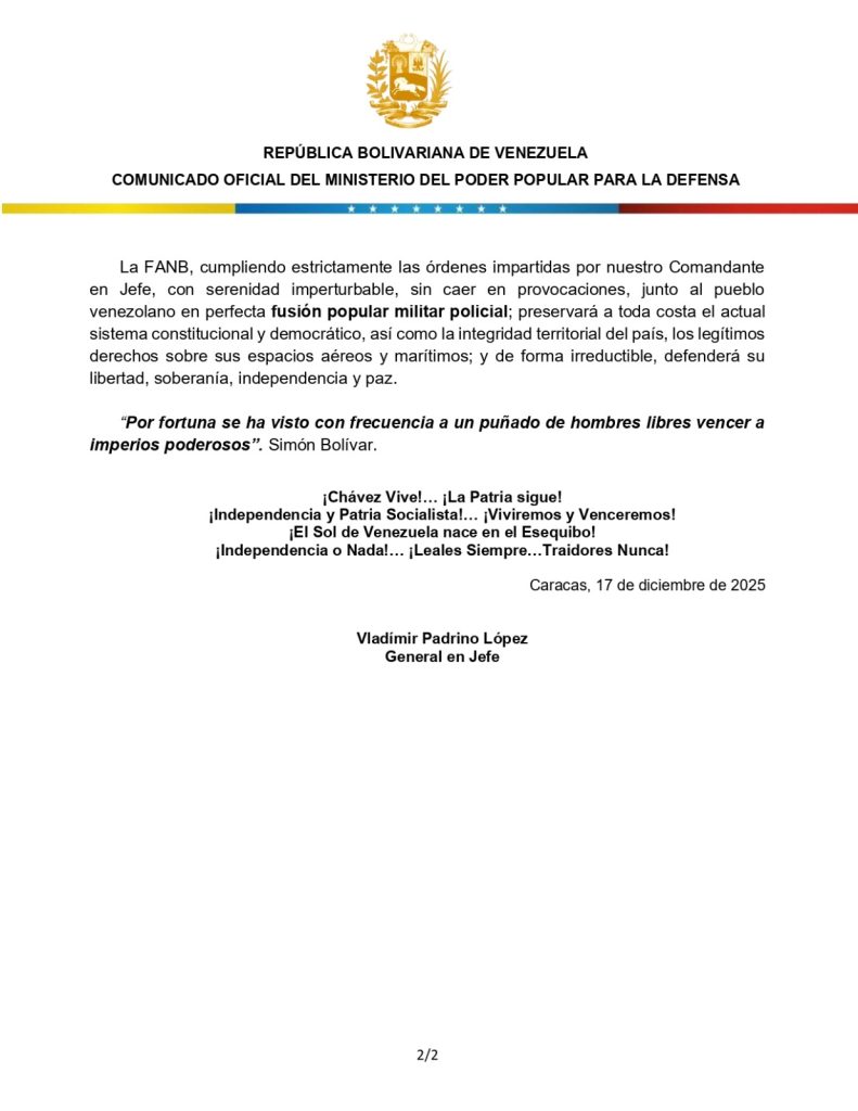 Comunicado Oficial del Ministro del Poder Popular para la Defensa, GJ. Vladímir Padrino López para denunciar las acciones del presidente Donald Trump y su intención de imponer un bloqueo marítimo total a Venezuela.Por GENESIS MICHELLE SALLORIN PINTO / 17/12/2025