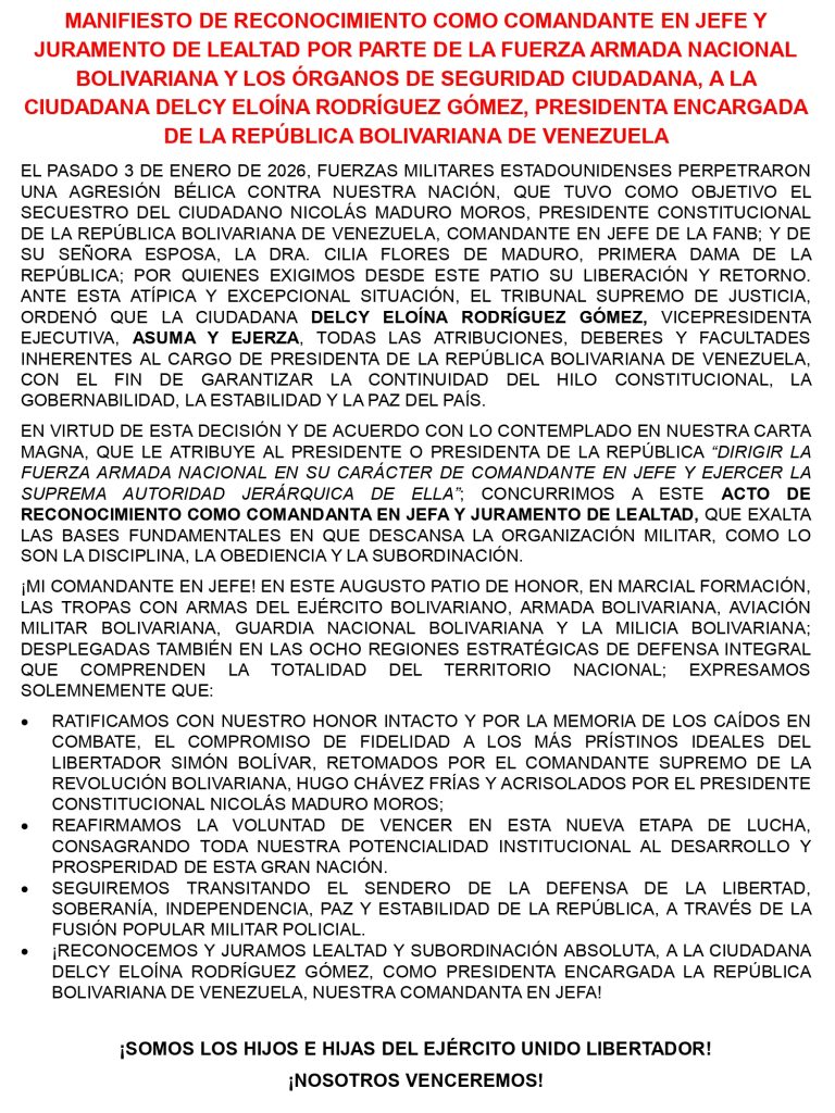 Manifiesto de reconocimiento como Comandante en Jefe y juramento de lealtad a la Presidenta (E) Delcy Rodríguez por parte de la FANB y los OSCPor GENESIS MICHELLE SALLORIN PINTO / 02/02/2026